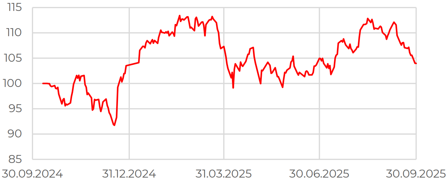В сентябре индекс МосБиржи скорректировался на 7,4%. Одним из факторов давления стала более консервативная, чем ожидали участники рынка, позиция ЦБ РФ по поводу денежно-кредитной политики. Регулятор снизил ключевую ставку всего на 100 б. п., до 17%, не оправдав надежд рынка, ожидавшего снижения на 200 б. п. Риторика при этом осталась нейтральной, предполагающей как повышение, так и снижение ставки.