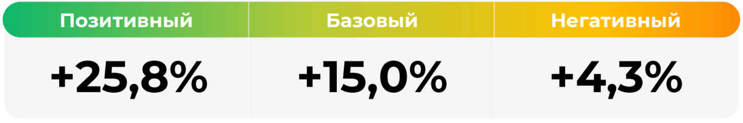 *Сценарные прогнозы (далее - Сценарии) рассчитаны на основании портфеля активов, составляющих имущество фонда в соответствии с Методикой расчета сценарных прогнозов открытых и биржевых паевых инвестиционных фондов под управлением УК "Альфа-Капитал", размещенной на сайте управляющей компании по адресу https://www.alfacapital.ru/disclosure/clients_info. Сценарии отражают аналитическую оценку потенциальной динамики совокупного портфеля активов за вычетом лимитированных в соответствии с правилами доверительного управления фондом размеров расходов и вознаграждений, подлежащих оплате за счет имущества фонда, и не являются гарантией или обещанием достижения соответствующих результатов в будущем. Инвестирование в финансовые инструменты сопряжено с рисками, в том числе с риском частичной потери инвестированных средств в связи с возможным неблагоприятным влиянием разного рода факторов. Фактические результаты инвестирования могут отличаться от представленных в расчетах Сценариев. Расчеты Сценариев ООО УК «Альфа-Капитал» осуществляются с использованием данных Сервиса прогнозов АО Петербургская Биржа.
