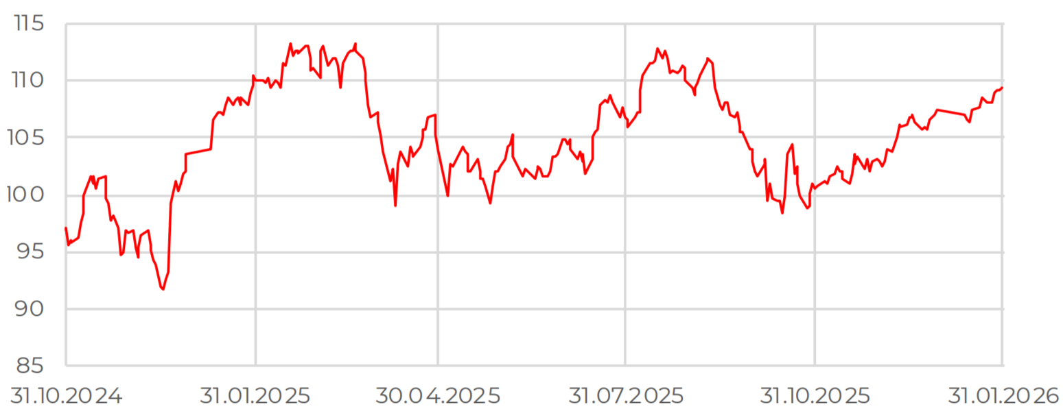 В январе российский рынок находился под влиянием глобальных факторов — эскалации геополитической напряженности на Ближнем Востоке, роста торговых рисков и опасений по поводу ослабления доллара США. Эти факторы спровоцировали переход инвесторов в защитные активы, включая золото и серебро, а также платину и палладий. Одновременно с этим цена на нефть марки Brent поднималась к отметке 70 долл. за баррель.
