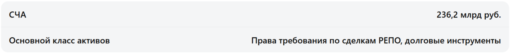 Фонд предназначен для размещения свободных средств в консервативные инструменты рынка РЕПО. Такие инвестиции сейчас характеризуются низким риском и высокой ликвидностью, что позволяет использовать фонд в том числе как инструмент для выжидательной позиции, когда нет увереннос ти в краткосрочных перспективах рынка, но есть желание быть ближе к нему. Ключевое отличие от депозита — ликвидность и ежедневное начисление в фонд доходов, полученных от краткосрочного размещения активов.