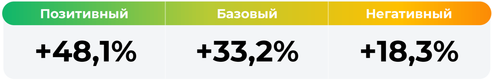 *Сценарные прогнозы (далее - Сценарии) рассчитаны на основании портфеля активов, составляющих имущество фонда в соответствии с Методикой расчета сценарных прогнозов открытых и биржевых паевых инвестиционных фондов под управлением УК "Альфа-Капитал", размещенной на сайте управляющей компании по адресу https://www.alfacapital.ru/disclosure/clients_info. Сценарии отражают аналитическую оценку потенциальной динамики совокупного портфеля активов за вычетом лимитированных в соответствии с правилами доверительного управления фондом размеров расходов и вознаграждений, подлежащих оплате за счет имущества фонда, и не являются гарантией или обещанием достижения соответствующих результатов в будущем. Инвестирование в финансовые инструменты сопряжено с рисками, в том числе с риском частичной потери инвестированных средств в связи с возможным неблагоприятным влиянием разного рода факторов. Фактические результаты инвестирования могут отличаться от представленных в расчетах Сценариев. Расчеты Сценариев ООО УК «Альфа-Капитал» осуществляются с использованием данных Сервиса прогнозов АО Петербургская Биржа.