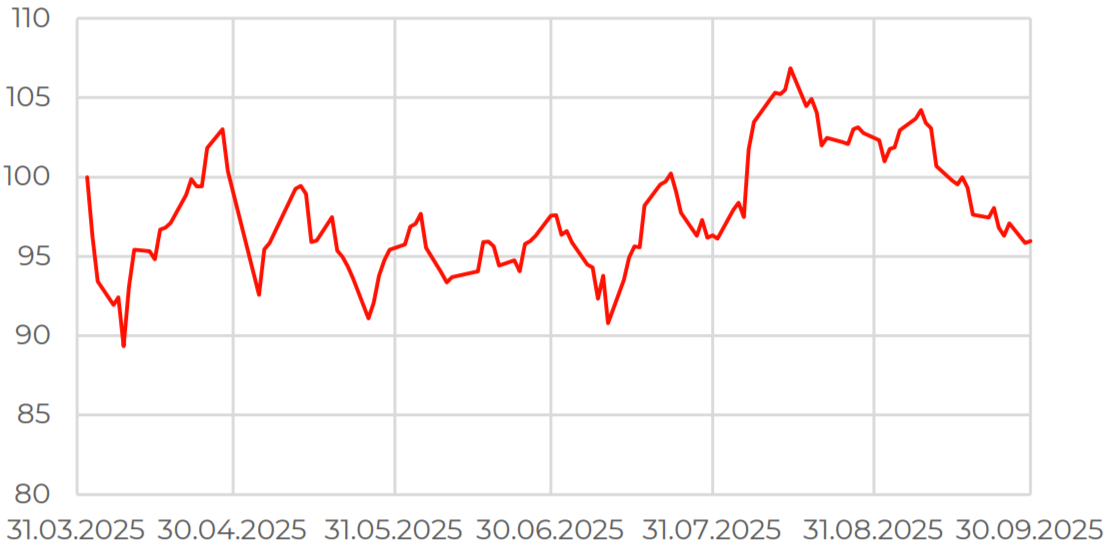 В октябре индекс МосБиржи снизился на 5,9%, приблизившись к минимумам декабря 2024 года. Настроения ухудшились из-за несостоявшейся встречи лидеров России и США, жесткой риторики Вашингтона в адрес РФ и анонсирования нового пакета санкций в отношении российского нефтяного экспорта. Переговорные контакты, вероятно, продолжатся, но вероятность быстрого прогресса невелика.