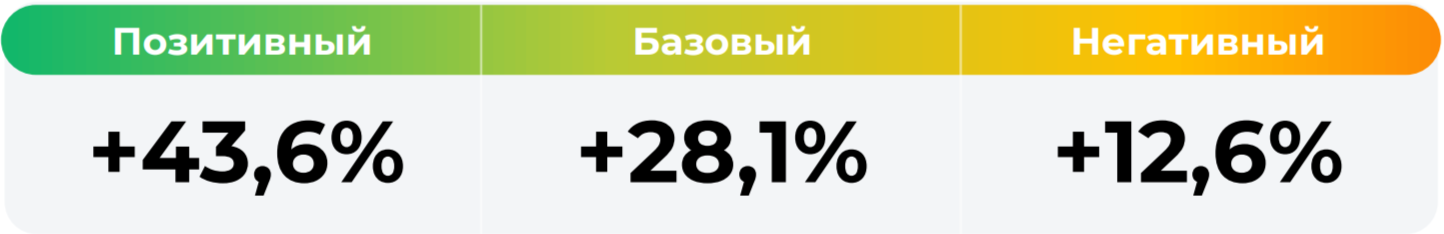 *Сценарные прогнозы (далее - Сценарии) рассчитаны на основании портфеля активов, составляющих имущество фонда в соответствии с Методикой расчета сценарных прогнозов открытых и биржевых паевых инвестиционных фондов под управлением УК "Альфа-Капитал", размещенной на сайте управляющей компании по адресу https://www.alfacapital.ru/disclosure/clients_info. Сценарии отражают аналитическую оценку потенциальной динамики совокупного портфеля активов за вычетом лимитированных в соответствии с правилами доверительного управления фондом размеров расходов и вознаграждений, подлежащих оплате за счет имущества фонда, и не являются гарантией или обещанием достижения соответствующих результатов в будущем. Инвестирование в финансовые инструменты сопряжено с рисками, в том числе с риском частичной потери инвестированных средств в связи с возможным неблагоприятным влиянием разного рода факторов. Фактические результаты инвестирования могут отличаться от представленных в расчетах Сценариев. Расчеты Сценариев ООО УК «Альфа-Капитал» осуществляются с использованием данных Сервиса прогнозов АО Петербургская Биржа.