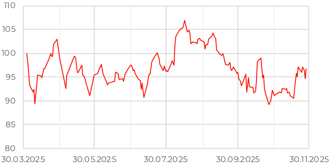 В ноябре динамику российского рынка акций определяли ожидания вокруг переговорного процесса. Во второй половине месяца диалог активизировался и поддержал котировки, однако отсутствие прогресса не позволяет ожидать скорого улучшения внешнеполитической ситуации. Несмотря на повышенную волатильность, индекс МосБиржи завершил месяц в плюсе на 6%.
