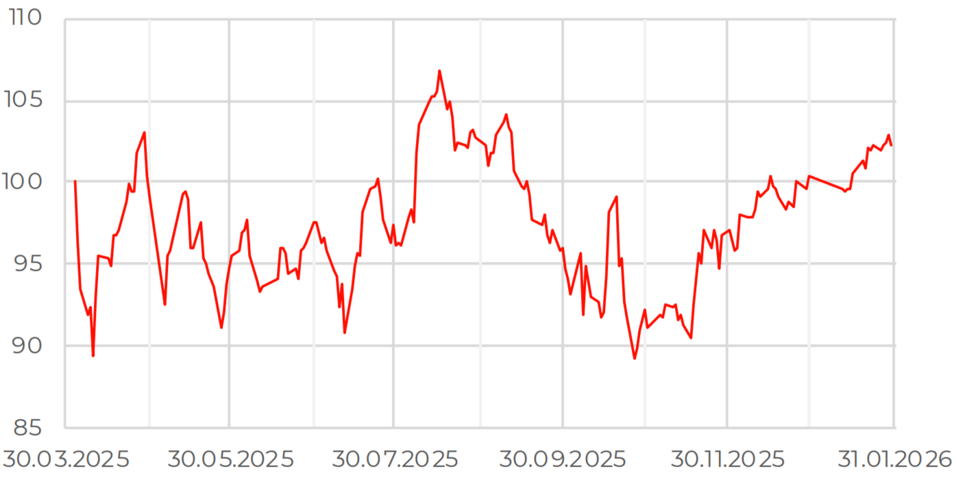 В январе российский рынок акций находился под влиянием глобальных факторов — эскалации геополитической напряженности на Ближнем Востоке, роста торговых рисков и опасений по поводу ослабления доллара США. Эти факторы спровоцировали переход инвесторов в защитные активы, включая золото и серебро, а также платину и палладий. Одновременно с этим цена на нефть марки Brent поднималась к отметке 70 долл. за баррель.