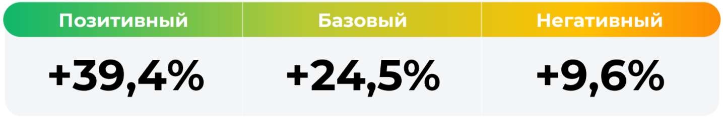 *Сценарные прогнозы (далее - Сценарии) рассчитаны на основании портфеля активов, составляющих имущество фонда в соответствии с Методикой расчета сценарных прогнозов открытых и биржевых паевых инвестиционных фондов под управлением УК "Альфа-Капитал", размещенной на сайте управляющей компании по адресу https://www.alfacapital.ru/disclosure/clients_info. Сценарии отражают аналитическую оценку потенциальной динамики совокупного портфеля активов за вычетом лимитированных в соответствии с правилами доверительного управления фондом размеров расходов и вознаграждений, подлежащих оплате за счет имущества фонда, и не являются гарантией или обещанием достижения соответствующих результатов в будущем. Инвестирование в финансовые инструменты сопряжено с рисками, в том числе с риском частичной потери инвестированных средств в связи с возможным неблагоприятным влиянием разного рода факторов. Фактические результаты инвестирования могут отличаться от представленных в расчетах Сценариев. Расчеты Сценариев ООО УК «Альфа-Капитал» осуществляются с использованием данных Сервиса прогнозов АО Петербургская Биржа.