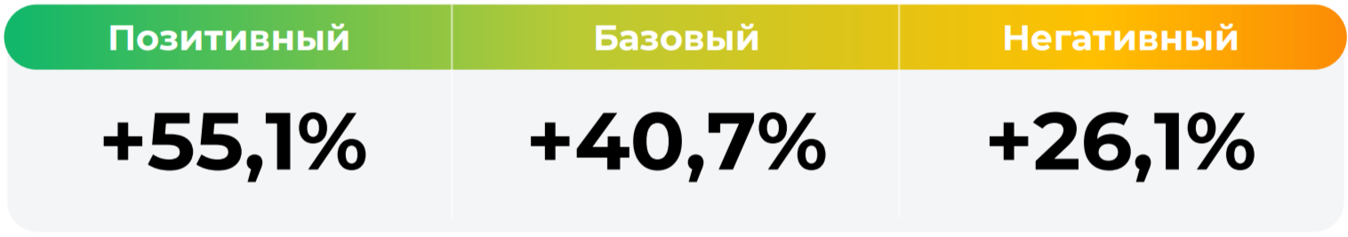*Сценарные прогнозы (далее - Сценарии) рассчитаны на основании портфеля активов, составляющих имущество фонда в соответствии с Методикой расчета сценарных прогнозов открытых и биржевых паевых инвестиционных фондов под управлением УК "Альфа-Капитал", размещенной на сайте управляющей компании по адресу https://www.alfacapital.ru/disclosure/clients_info. Сценарии отражают аналитическую оценку потенциальной динамики совокупного портфеля активов за вычетом лимитированных в соответствии с правилами доверительного управления фондом размеров расходов и вознаграждений, подлежащих оплате за счет имущества фонда, и не являются гарантией или обещанием достижения соответствующих результатов в будущем. Инвестирование в финансовые инструменты сопряжено с рисками, в том числе с риском частичной потери инвестированных средств в связи с возможным неблагоприятным влиянием разного рода факторов. Фактические результаты инвестирования могут отличаться от представленных в расчетах Сценариев. Расчеты Сценариев ООО УК «Альфа-Капитал» осуществляются с использованием данных Сервиса прогнозов АО Петербургская Биржа.