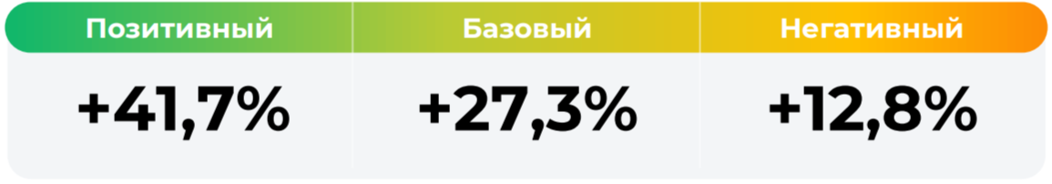 *Сценарные прогнозы (далее - Сценарии) рассчитаны на основании портфеля активов, составляющих имущество фонда в соответствии с Методикой расчета сценарных прогнозов открытых и биржевых паевых инвестиционных фондов под управлением УК "Альфа-Капитал", размещенной на сайте управляющей компании по адресу https://www.alfacapital.ru/disclosure/clients_info. Сценарии отражают аналитическую оценку потенциальной динамики совокупного портфеля активов за вычетом лимитированных в соответствии с правилами доверительного управления фондом размеров расходов и вознаграждений, подлежащих оплате за счет имущества фонда, и не являются гарантией или обещанием достижения соответствующих результатов в будущем. Инвестирование в финансовые инструменты сопряжено с рисками, в том числе с риском частичной потери инвестированных средств в связи с возможным неблагоприятным влиянием разного рода факторов. Фактические результаты инвестирования могут отличаться от представленных в расчетах Сценариев. Расчеты Сценариев ООО УК «Альфа-Капитал» осуществляются с использованием данных Сервиса прогнозов АО Петербургская Биржа.