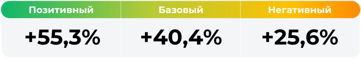 *Сценарные прогнозы (далее - Сценарии) рассчитаны на основании портфеля активов, составляющих имущество фонда в соответствии с Методикой расчета сценарных прогнозов открытых и биржевых паевых инвестиционных фондов под управлением ООО УК "Альфа Капитал", размещенной на сайте управляющей компании по адресу https://www.alfacapital.ru/disclosure/clients_info. Сценарии отражают аналитическую оценку потенциальной динамики совокупного портфеля активов за вычетом лимитированных в соответствии с правилами доверительного управления фондом размеров расходов и вознаграждений, подлежащих оплате за счет имущества фонда, и не являются гарантией или обещанием достижения соответствующих результатов в будущем. Инвестирование в финансовые инструменты сопряжено с рисками, в том числе с риском частичной потери инвестированных средств в связи с возможным неблагоприятным влиянием разного рода факторов. Фактические результаты инвестирования могут отличаться от представленных в расчетах Сценариев. Расчеты Сценариев ООО УК «Альфа-Капитал» осуществляются с использованием данных Сервиса прогнозов АО Петербургская Биржа.
