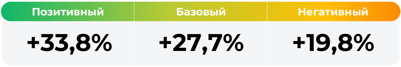 *Сценарные прогнозы (далее - Сценарии) рассчитаны на основании портфеля активов, составляющих имущество фонда в соответствии с Методикой расчета сценарных прогнозов открытых и биржевых паевых инвестиционных фондов под управлением ООО УК "Альфа Капитал", размещенной на сайте управляющей компании по адресу https://www.alfacapital.ru/disclosure/clients_info. Сценарии отражают аналитическую оценку потенциальной динамики совокупного портфеля активов за вычетом лимитированных в соответствии с правилами доверительного управления фондом размеров расходов и вознаграждений, подлежащих оплате за счет имущества фонда, и не являются гарантией или обещанием достижения соответствующих результатов в будущем. Инвестирование в финансовые инструменты сопряжено с рисками, в том числе с риском частичной потери инвестированных средств в связи с возможным неблагоприятным влиянием разного рода факторов. Фактические результаты инвестирования могут отличаться от представленных в расчетах Сценариев. Расчеты Сценариев ООО УК «Альфа-Капитал» осуществляются с использованием данных Сервиса прогнозов АО Петербургская Биржа.
