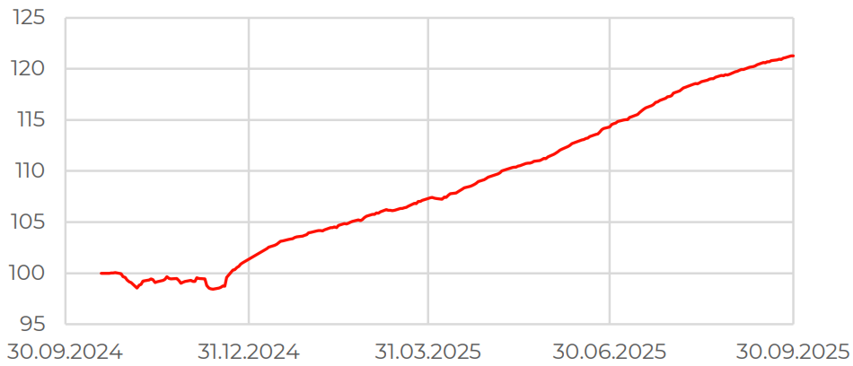 Для бумаг с плавающим купоном более высокая траектория ключевой ставки означает, что поддержка купонной доходности сохранится дольше, чем предполагалось. В то же время в октябре на фоне коррекции облигаций с фиксированным купоном корпоративные кредитные спреды расширились. Это оказало определенное давление и на облигации с плавающим купоном (кредитный риск не учитывается при определении размера купона).