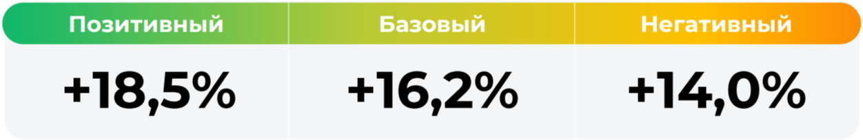 *Сценарные прогнозы (далее - Сценарии) рассчитаны на основании портфеля активов, составляющих имущество фонда в соответствии с Методикой расчета сценарных прогнозов открытых и биржевых паевых инвестиционных фондов под управлением УК "Альфа-Капитал", размещенной на сайте управляющей компании по адресу https://www.alfacapital.ru/disclosure/clients_info. Сценарии отражают аналитическую оценку потенциальной динамики совокупного портфеля активов за вычетом лимитированных в соответствии с правилами доверительного управления фондом размеров расходов и вознаграждений, подлежащих оплате за счет имущества фонда, и не являются гарантией или обещанием достижения соответствующих результатов в будущем. Инвестирование в финансовые инструменты сопряжено с рисками, в том числе с риском частичной потери инвестированных средств в связи с возможным неблагоприятным влиянием разного рода факторов. Фактические результаты инвестирования могут отличаться от представленных в расчетах Сценариев. Расчеты Сценариев ООО УК «Альфа-Капитал» осуществляются с использованием данных Сервиса прогнозов АО Петербургская Биржа.