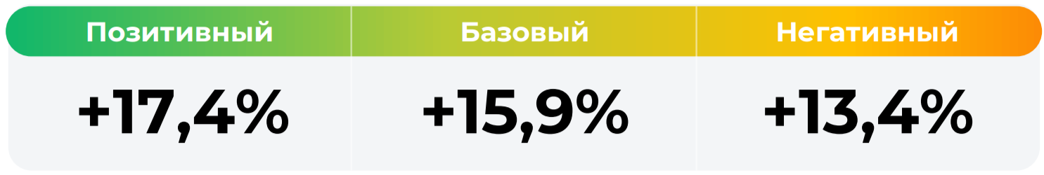 *Сценарные прогнозы (далее - Сценарии) рассчитаны на основании портфеля активов, составляющих имущество фонда в соответствии с Методикой расчета сценарных прогнозов открытых и биржевых паевых инвестиционных фондов под управлением УК "Альфа-Капитал", размещенной на сайте управляющей компании по адресу https://www.alfacapital.ru/disclosure/clients_info. Сценарии отражают аналитическую оценку потенциальной динамики совокупного портфеля активов за вычетом лимитированных в соответствии с правилами доверительного управления фондом размеров расходов и вознаграждений, подлежащих оплате за счет имущества фонда, и не являются гарантией или обещанием достижения соответствующих результатов в будущем. Инвестирование в финансовые инструменты сопряжено с рисками, в том числе с риском частичной потери инвестированных средств в связи с возможным неблагоприятным влиянием разного рода факторов. Фактические результаты инвестирования могут отличаться от представленных в расчетах Сценариев. Расчеты Сценариев ООО УК «Альфа-Капитал» осуществляются с использованием данных Сервиса прогнозов АО Петербургская Биржа.