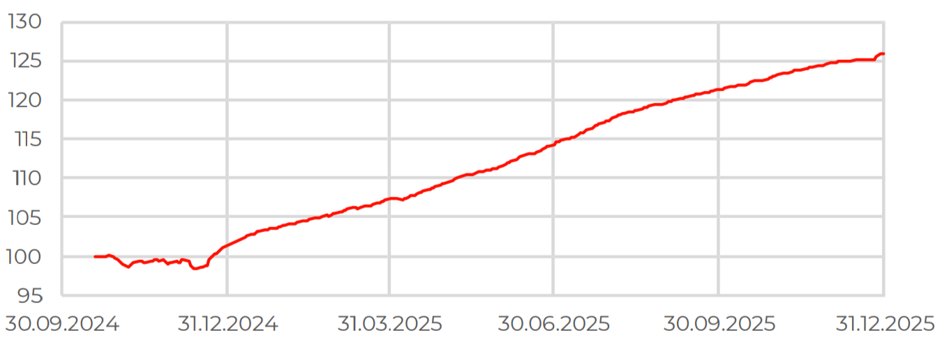 По нашему мнению, расширение кредитных спредов было связано с запланированным повышением надбавок к нормативу краткосрочной ликвидности (ННКЛ) для системно значимых банков с 80% до 100% с 1 января 2026 года. Это могло стимулировать продажи корпоративных облигаций среди ряда участников рынка для соблюдения регуляторных требований.