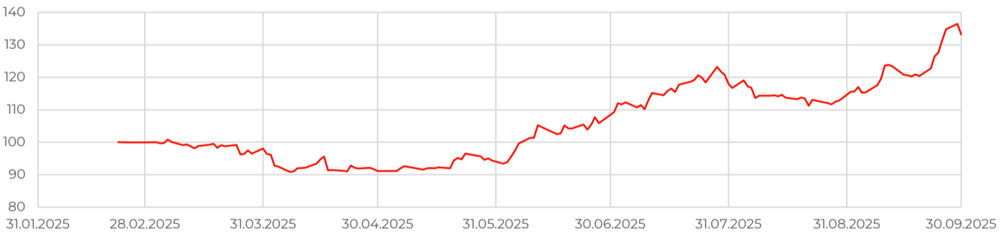 За сентябрь спотовая цена на платину выросла на 15,3%, приблизившись к отметке в 1 600 долл. за унцию. Палладий подорожал на 13,1%, до 1 260 долл. за унцию. Сильная динамика котировок поддерживается общим структурным дефицитом на рынке обоих металлов. Кроме того, повышается интерес со стороны ювелиров и инвесторов, которые выбирают МПГ как альтернативу подорожавшему золоту. World Platinum Investment Council ожидает сохранения дефицита на рынке платины вплоть до 2029 года и возвращения к профициту предложения палладия в 2027 году.