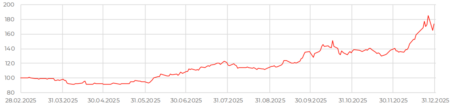 За декабрь цена на платину выросла на 20,9%, до 2 020,5 долл. за унцию. Палладий подорожал на 10,2%, до 1 615,3 долл. за унцию. Сильная динамика котировок поддерживается общим структурным дефицитом на рынке обоих металлов. Кроме того, повышается интерес со стороны ювелиров и инвесторов, которые выбирают МПГ как альтернативу подорожавшему золоту. World Platinum Investment Council ожидает сохранения дефицита на рынке платины вплоть до 2029 года и возвращения к профициту предложения палладия в 2027 году.
