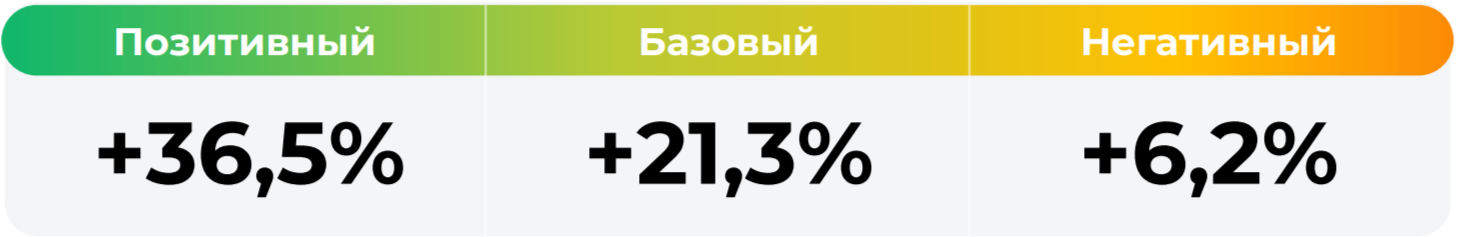 *Сценарные прогнозы (далее - Сценарии) рассчитаны на основании портфеля активов, составляющих имущество фонда в соответствии с Методикой расчета сценарных прогнозов открытых и биржевых паевых инвестиционных фондов под управлением ООО УК "Альфа Капитал", размещенной на сайте управляющей компании по адресу https://www.alfacapital.ru/disclosure/clients_info. Сценарии отражают аналитическую оценку потенциальной динамики совокупного портфеля активов за вычетом лимитированных в соответствии с правилами доверительного управления фондом размеров расходов и вознаграждений, подлежащих оплате за счет имущества фонда, и не являются гарантией или обещанием достижения соответствующих результатов в будущем. Инвестирование в финансовые инструменты сопряжено с рисками, в том числе с риском частичной потери инвестированных средств в связи с возможным неблагоприятным влиянием разного рода факторов. Фактические результаты инвестирования могут отличаться от представленных в расчетах Сценариев. Расчеты Сценариев ООО УК «Альфа-Капитал» осуществляются с использованием данных Сервиса прогнозов АО Петербургская Биржа.