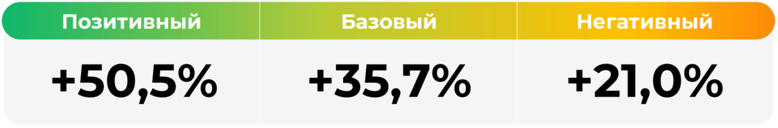 Сценарии отражают аналитическую оценку потенциальной динамики совокупного портфеля активов за вычетом лимитированных в соответствии с правилами доверительного управления фондом размеров расходов и вознаграждений, подлежащих оплате за счет имущества фонда, и не являются гарантией или обещанием достижения соответствующих результатов в будущем. Инвестирование в финансовые инструменты сопряжено с рисками, в том числе с риском частичной потери инвестированных средств в связи с возможным неблагоприятным влиянием разного рода факторов. Фактические результаты инвестирования могут отличаться от представленных в расчетах Сценариев. Расчеты Сценариев ООО УК «Альфа-Капитал» осуществляются с использованием данных Сервиса прогнозов АО Петербургская Биржа.