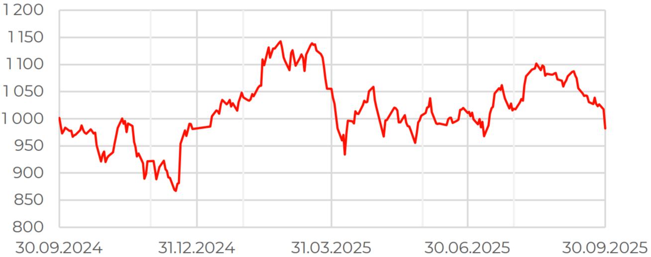 В сентябре индекс МосБиржи скорректировался на 7,4%. Одним из факторов давления стала более консервативная, чем ожидали участники рынка, позиция Банка России: регулятор снизил ключевую ставку на 100 б. п., до 17%, не оправдав ожидания рынка, рассчитывавшего на 200 б. п., и сохранил нейтральный сигнал.
