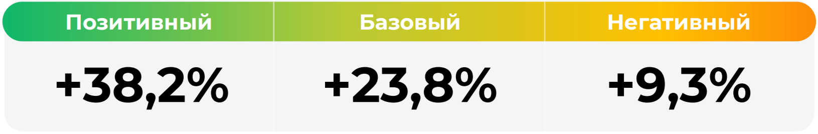 *Сценарные прогнозы (далее - Сценарии) рассчитаны на основании портфеля активов, составляющих имущество фонда в соответствии с Методикой расчета сценарных прогнозов открытых и биржевых паевых инвестиционных фондов под управлением УК "Альфа-Капитал", размещенной на сайте управляющей компании по адресу https://www.alfacapital.ru/disclosure/clients_info. Сценарии отражают аналитическую оценку потенциальной динамики совокупного портфеля активов за вычетом лимитированных в соответствии с правилами доверительного управления фондом размеров расходов и вознаграждений, подлежащих оплате за счет имущества фонда, и не являются гарантией или обещанием достижения соответствующих результатов в будущем. Инвестирование в финансовые инструменты сопряжено с рисками, в том числе с риском частичной потери инвестированных средств в связи с возможным неблагоприятным влиянием разного рода факторов. Фактические результаты инвестирования могут отличаться от представленных в расчетах Сценариев. Расчеты Сценариев ООО УК «Альфа-Капитал» осуществляются с использованием данных Сервиса прогнозов АО Петербургская Биржа.