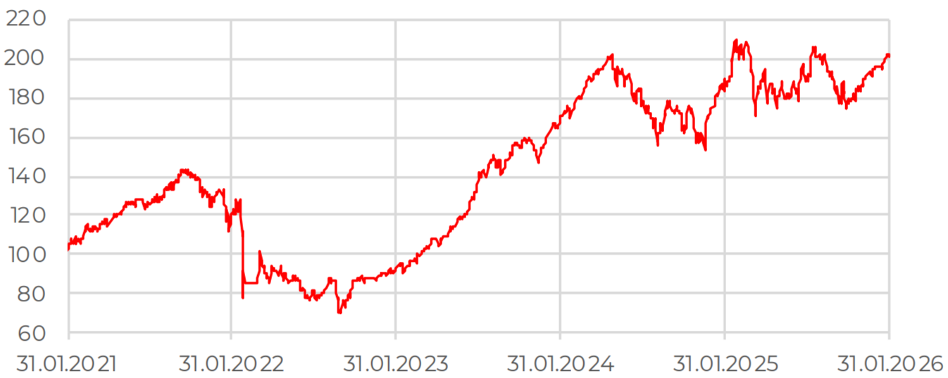 В январе российский рынок акций находился под влиянием глобальных факторов — эскалации геополитической напряженности на Ближнем Востоке, роста торговых рисков и опасений по поводу ослабления доллара США. Эти факторы спровоцировали переход инвесторов в защитные активы, включая золото и серебро, а также платину и палладий. Одновременно с этим цена на нефть марки Brent поднималась к отметке 70 долл. за баррель.