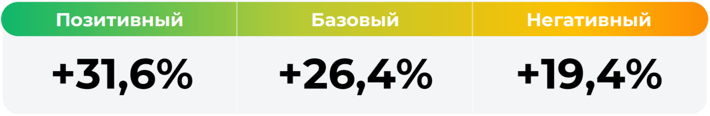 Обновленная оценка средней ключевой ставки предполагает возможность как сохранения текущего значения в декабре, так и снижения до 16%. Ориентир на 2026 год повышен с 12–13% до 13–15%. Это указывает на широкий диапазон ставки на конец года — по нашим оценкам, от 10% до 14%.