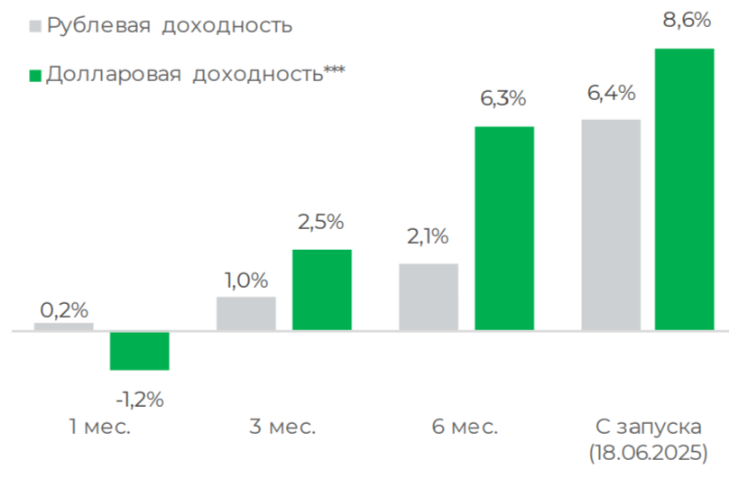 *** Долларовая доходность рассчитывается путем конвертации расчетной стоимости паев в доллары США по курсу ЦБ РФ на соответствующие даты указанных периодов.