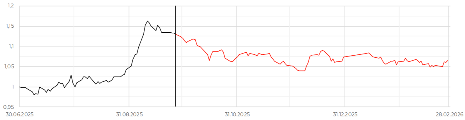Прошедший месяц оказался самым волатильным для юаневых ставок с ноября 2024 года. Средневзвешенная ставка в юаневом свопе достигала 9,77%. Ставка юаневого репо RUSFAR CNY подскакивала до 12,77%, что также было максимумом с ноября 2024 года. При этом явных фундаментальных причин для столь резкого роста ставок овернайт не наблюдается.
