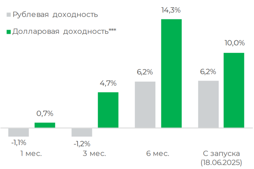 *** Долларовая доходность рассчитывается путем конвертации расчетной стоимости паев в доллары США по курсу ЦБ РФ на соответствующие даты указанных периодов.