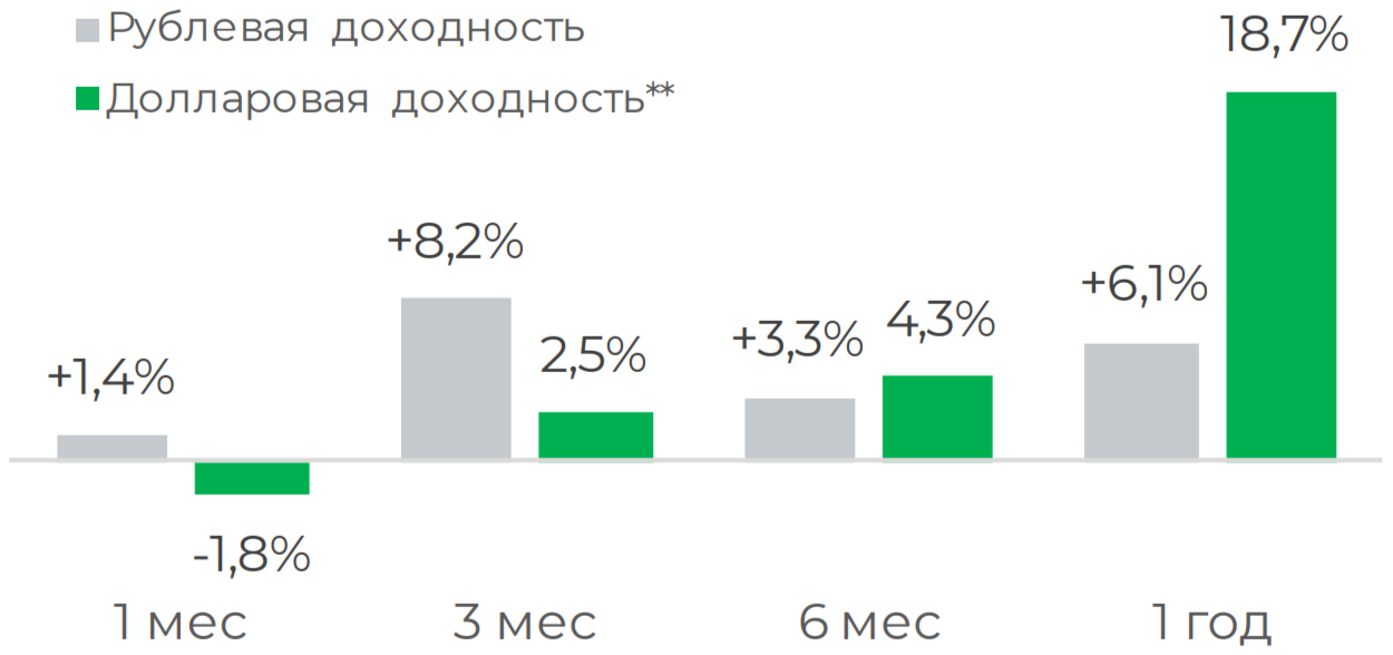 ** Долларовая доходность рассчитывается путем конвертации расчетной стоимости паев в доллары США по курсу ЦБ РФ на соответствующие даты указанных периодов.