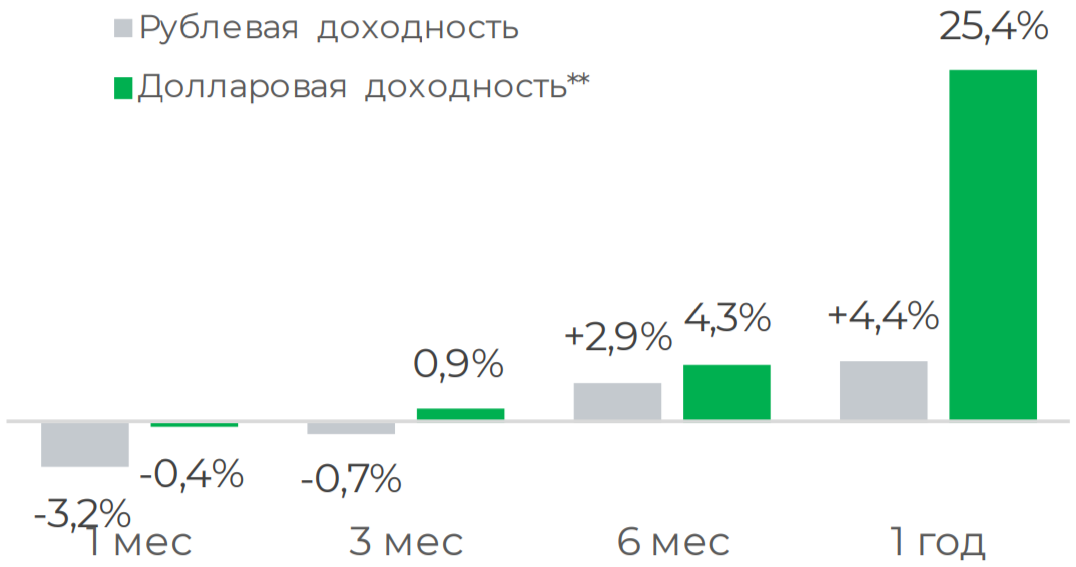 ** Долларовая доходность рассчитывается путем конвертации р асчетной стоимости паев в доллары США по курсу ЦБ РФ на соответствующие даты указанных периодов.