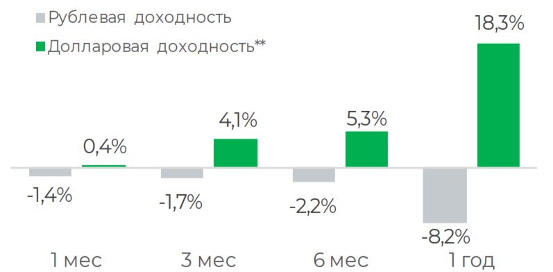 ** Долларовая доходность рассчитывается путем конвертации расчетной стоимости паев в доллары США по курсу ЦБ РФ на соответствующие даты указанных периодов.