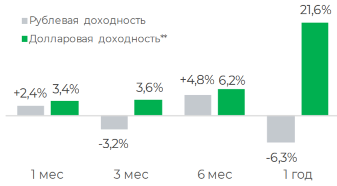 ** Долларовая доходность рассчитывается путем конвертации расчетной стоимости паев в доллары США по курсу ЦБ РФ на соответствующие даты указанных периодов.