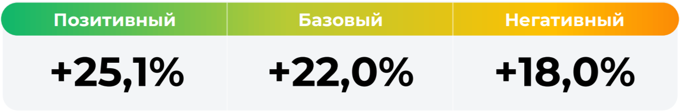 *Сценарные прогнозы (далее - Сценарии) рассчитаны на основании портфеля активов, составляющих имущество фонда в соответствии с Методикой расчета сценарных прогнозов открытых и биржевых паевых инвестиционных фондов под управлением ООО УК "Альфа Капитал", размещенной на сайте управляющей компании по адресу https://www.alfacapital.ru/disclosure/clients_info. Сценарии отражают аналитическую оценку потенциальной динамики совокупного портфеля активов за вычетом лимитированных в соответствии с правилами доверительного управления фондом размеров расходов и вознаграждений, подлежащих оплате за счет имущества фонда, и не являются гарантией или обещанием достижения соответствующих результатов в будущем. Инвестирование в финансовые инструменты сопряжено с рисками, в том числе с риском частичной потери инвестированных средств в связи с возможным неблагоприятным влиянием разного рода факторов. Фактические результаты инвестирования могут отличаться от представленных в расчетах Сценариев. Расчеты Сценариев ООО УК «Альфа-Капитал» осуществляются с использованием данных Сервиса прогнозов АО Петербургская Биржа.