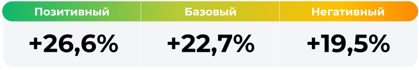 *Сценарные прогнозы (далее - Сценарии) рассчитаны на основании портфеля активов, составляющих имущество фонда в соответствии с Методикой расчета сценарных прогнозов открытых и биржевых паевых инвестиционных фондов под управлением ООО УК "Альфа Капитал", размещенной на сайте управляющей компании по адресу https://www.alfacapital.ru/disclosure/clients_info. Сценарии отражают аналитическую оценку потенциальной динамики совокупного портфеля активов за вычетом лимитированных в соответствии с правилами доверительного управления фондом размеров расходов и вознаграждений, подлежащих оплате за счет имущества фонда, и не являются гарантией или обещанием достижения соответствующих результатов в будущем. Инвестирование в финансовые инструменты сопряжено с рисками, в том числе с риском частичной потери инвестированных средств в связи с возможным неблагоприятным влиянием разного рода факторов. Фактические результаты инвестирования могут отличаться от представленных в расчетах Сценариев. Расчеты Сценариев ООО УК «Альфа-Капитал» осуществляются с использованием данных Сервиса прогнозов АО Петербургская Биржа.