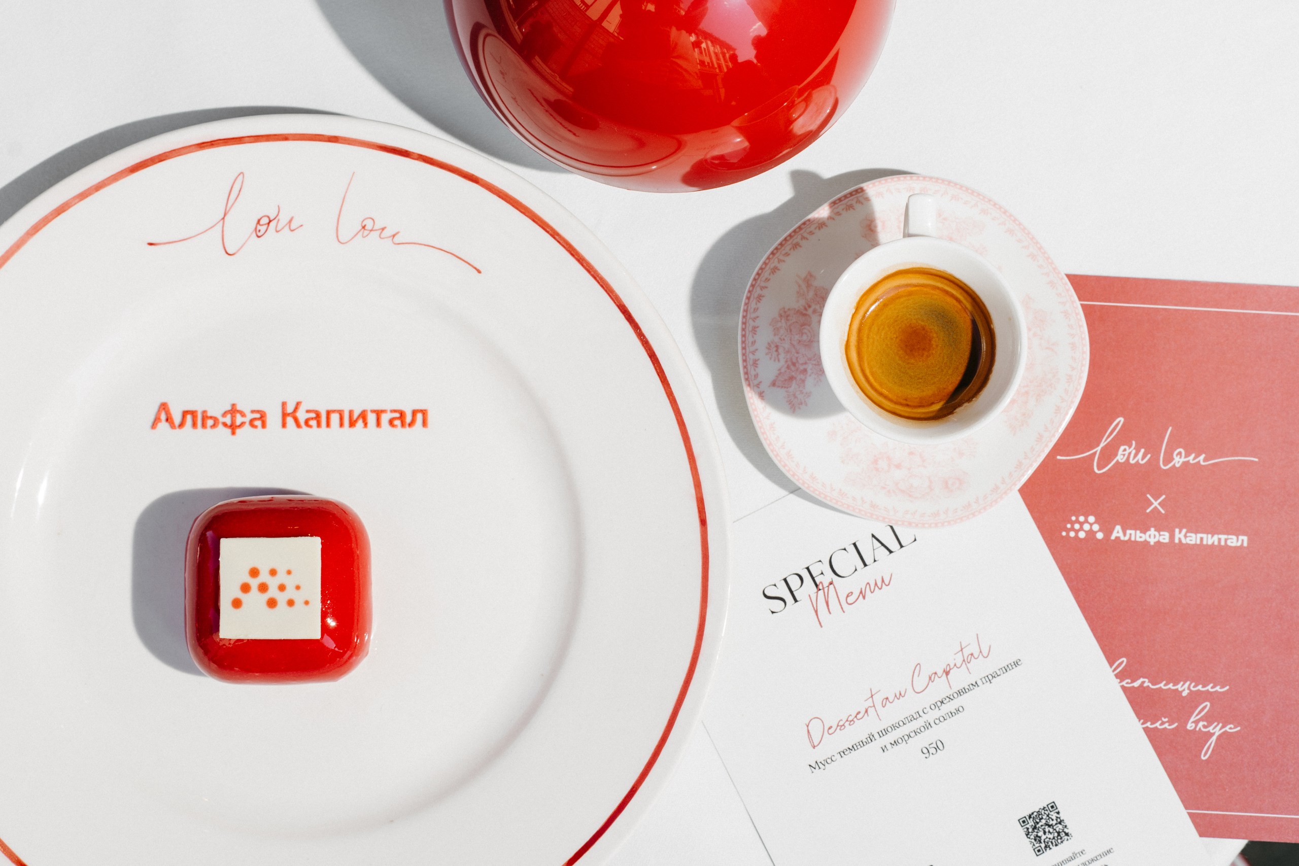 Специально для коллаборации шеф-кондитер ресторана Lou Lou разработал Dessert au Capital на основе мусса из темного шоколада с ореховым пралине и морской солью, оформление и цвет которого отсылают к узнаваемому логотипу бренда. Клиенты «Альфа-Капитал» смогут попробовать десерт бесплатно при предъявлении кодового слова.