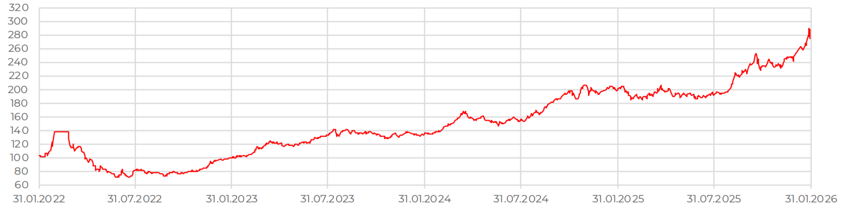 В январе спотовая цена на золото выросла на 13,5%. В течение нескольких торговых дней котировки металла превышали отметку в 5 000 долл. за тройскую унцию, обновляя исторические максимумы, однако в конце месяца цена резко скорректировалась вниз.