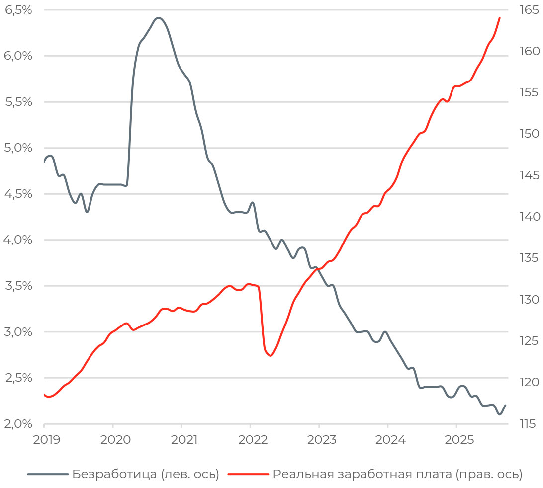 Безработица в сентябре поднялась до 2,2% с исторического минимума в 2,1% в августе. Впрочем, рост показателя отражает лишь возвращение к уровням мая-июля и обусловлен сезонным фактором. Среднее время поиска работы сократилось до 4,8 месяца, но остается близким к рекордному минимуму, достигнутому в июле (4,6 месяца).
