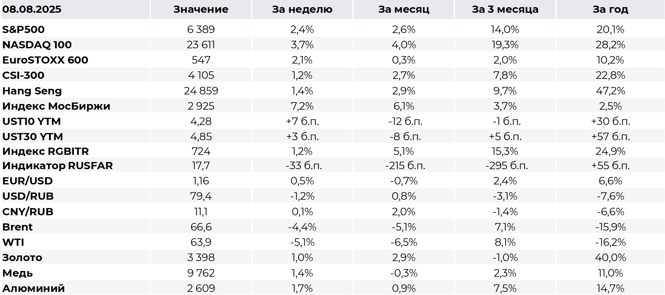 7 августа в силу вступил новый раунд импортных пошлин, хотя несколько крупных торговых партнеров США уже достигли соглашения до дедлайна. Реакция рынка на пошлины становится все более сдержанной. Дональд Трамп заявил об удвоении пошлин на индийские товары до 50% в качестве санкции за то, что Дели закупает российскую нефть. Новая ставка вступит в силу с 28 августа. Впрочем, в действительности причиной повышения тарифов для Индии, скорее всего, являются не закупки российского сырья (пошлины не повышены для Китая, который продолжает импортировать нефть из РФ), а отказ страны от заключения сделки на условиях, выгодных США.