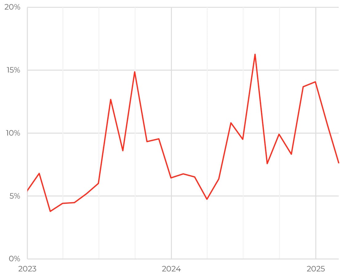 Рубль продолжает укрепляться: согласно данным ЦБ РФ, курс доллара США вплотную приблизился к 85 руб., а юань подешевел до 11,8 рубля. Таких резких движений на валютном рынке уже давно не наблюдалось — по подсчетам ЦБ, в феврале колебания курсов иностранных валют достигли максимального с 2022 года диапазона.