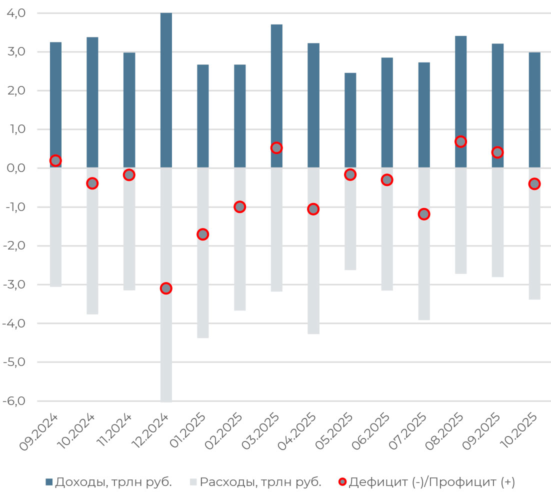 В октябре федеральный бюджет был исполнен с умеренным дефицитом в размере 402 млрд руб. Накопленный за 10 месяцев 2025 года дефицит составил 4,18 трлн руб. против 0,1 трлн руб. годом ранее.