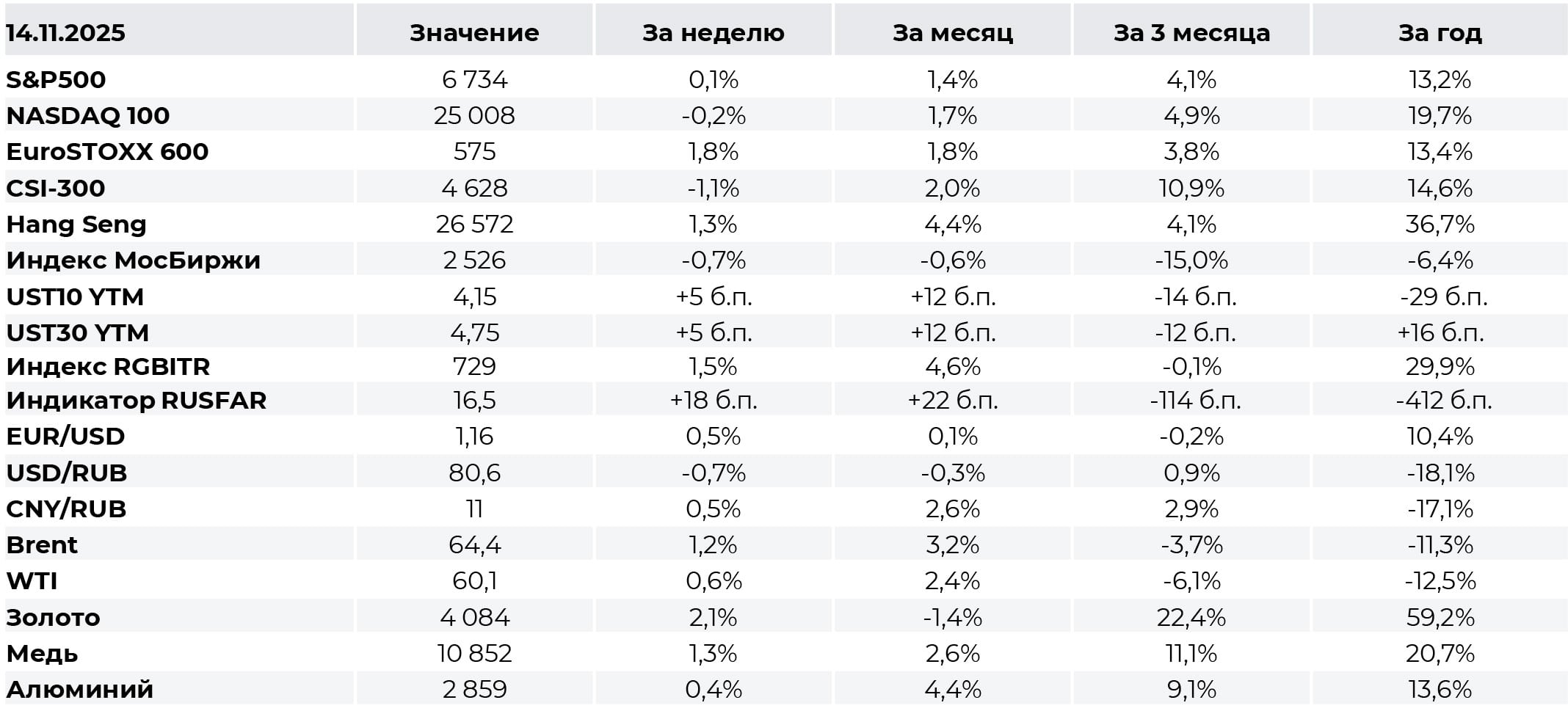 В конце недели индексы восстановили позиции за счет снижения политической неопределенности: Дональд Трамп подписал закон о финансировании федерального правительства до 30 января, завершив самый длительный шатдаун в истории. Впрочем, глубокие разногласия между партиями сохраняются, а сроки возобновления работы госорганов в полном объеме неясны. Кроме того, приостановка в сборе и публикации макроданых осложняет оценку экономической ситуации и затрудняет процесс принятие решений для Федрезерва.