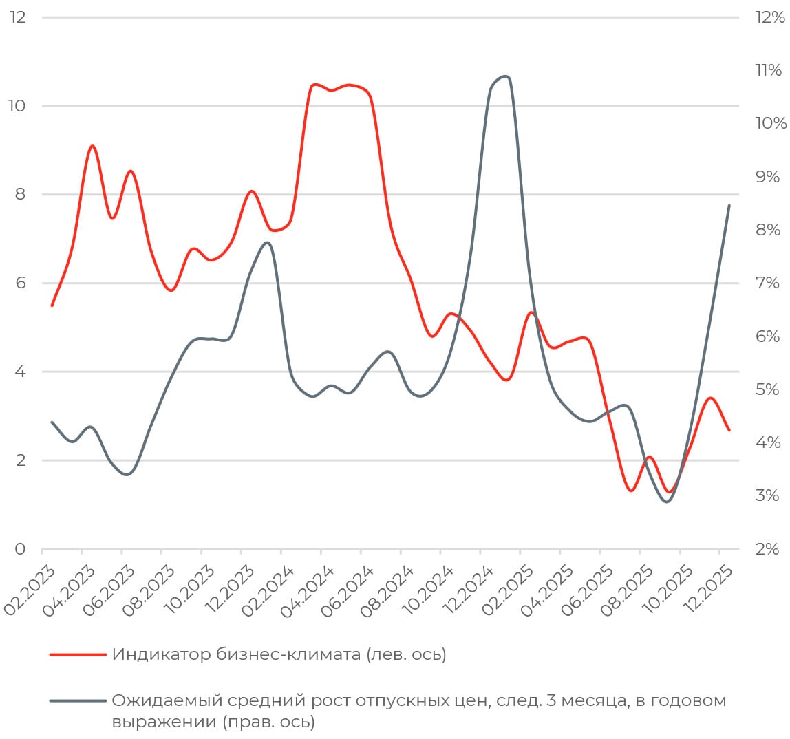 Ценовые ожидания бизнеса увеличились третий месяц подряд и остаются на повышенном уровне в 25 пунктов, обновив очередной максимум с января 2025 года. Рост ожиданий по ценам в основном связан с увеличением налоговой нагрузки с января.