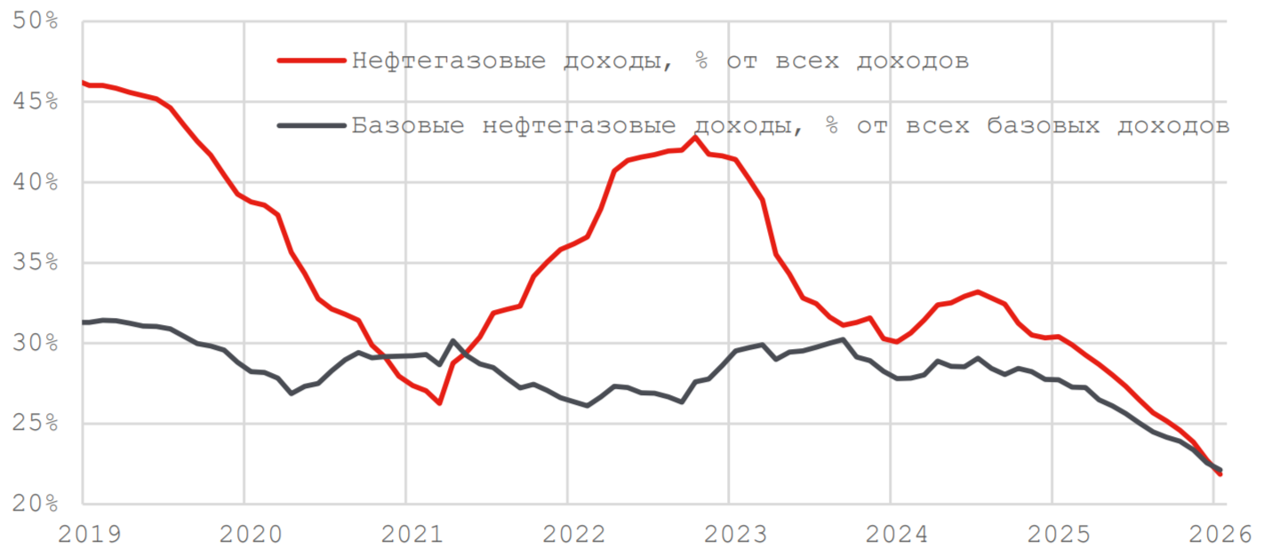 Отмечаемая общая тенденция к снижению доли нефтегазовых доходов бюджета при корректировке на бюджетное правило уже не так очевидна. Ощутимое снижение зависимости бюджета от нефтегазовых доходов наблюдается только с 2025 года, зато за год их доля снизилась почти до 22%. До этого момента базовые нефтегазовые доходы колебались в районе 27-30% базовых доходов бюджета.