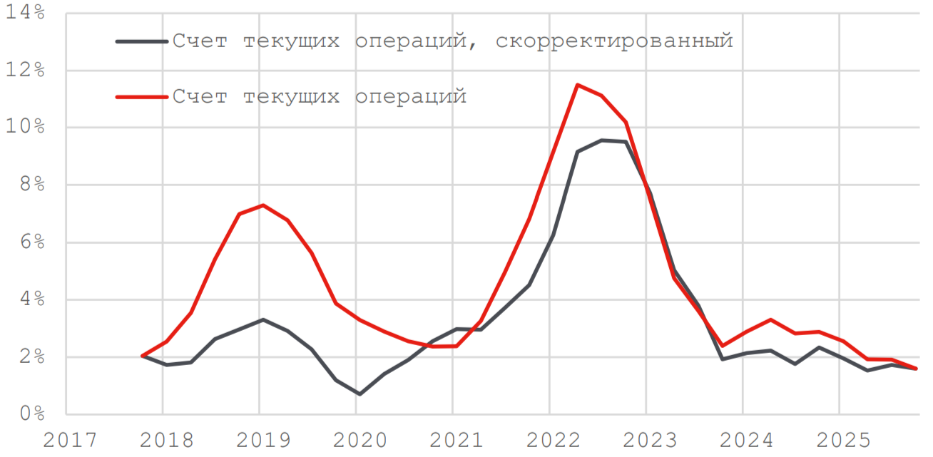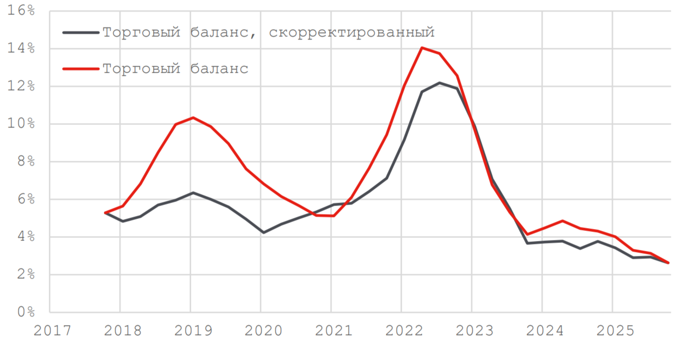 Корректировка на бюджетное правило немного сглаживает торговый профицит. При этом текущие его значения остаются на рекордно низких значениях (около 2.6% ВВП).
