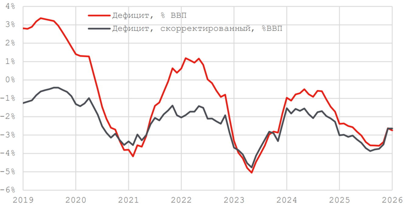 Кстати, не менее интересная картина складывается и с бюджетом. Если вычесть нормативные сверхдоходы, то оказывается, мы имеем хронический, дефицит бюджета. По итогам 2025 года общий и скорректированный дефицит отличаются не очень значительно, что нормально для периодов низких цен на нефть.