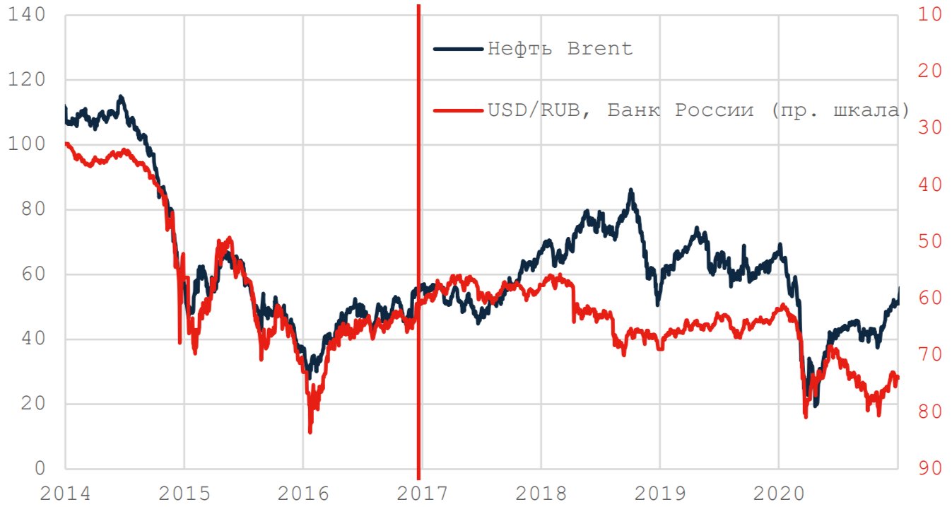Данный механизм себя очень хорошо зарекомендовал. Если до 2017 года рубль и нефть ходили «рука об руку» (хорошо видно на графике, где курс рубля инвертирован для удобства восприятия), то после его включения в 2017 году цена на нефть и рубль стали «жить отдельно», и рубль стал в большей степени зависим от движения капитала, ненефтегазового экспорта, импорта, настроений инвесторов.
