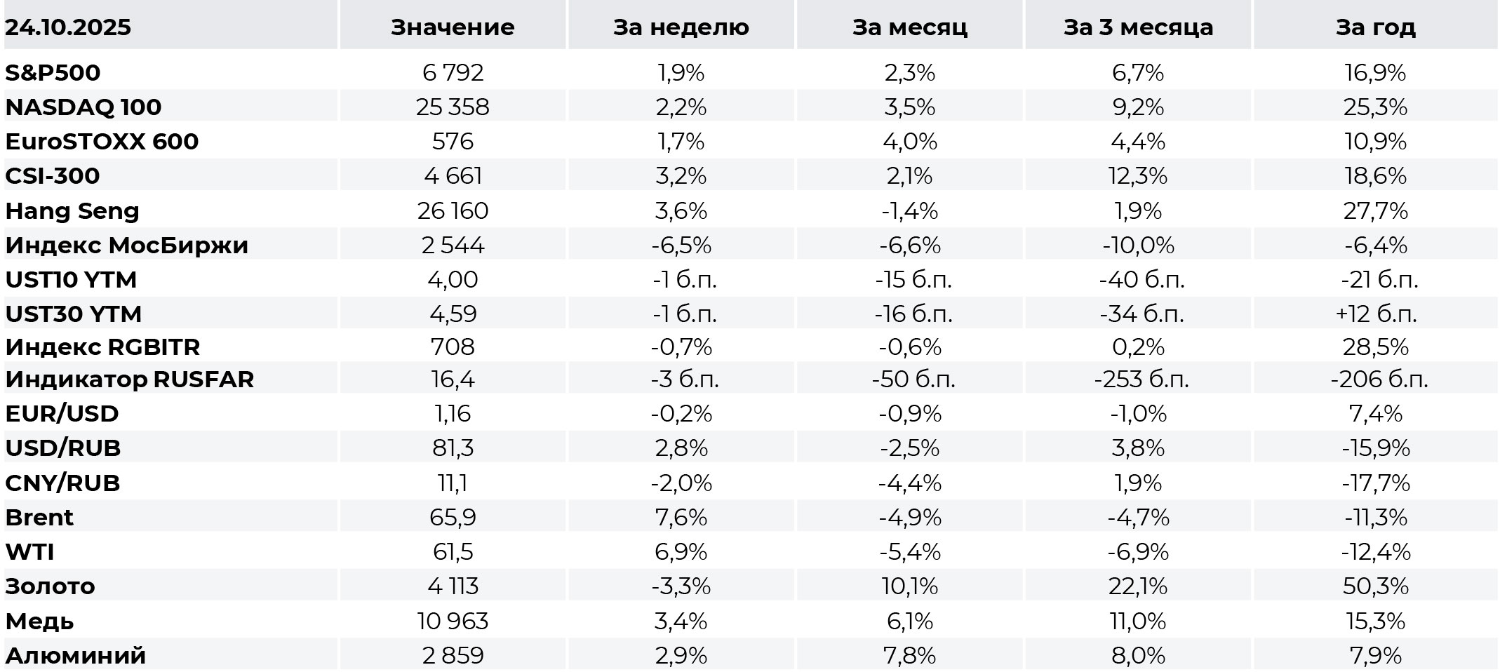 Несмотря на продолжающийся шатдаун в работе правительства США, в прошлую пятницу были опубликованы отложенные более чем на неделю данные потребительской инфляции за сентябрь. «Заголовочный» CPI показал рост на 3%, несколько быстрее 2,9% в августе, но мягче консенсус-прогноза на уровне 3,1%. Месячные темпы также оказались ниже ожидаемых: 0,3% vs 0,4% соответственно. Базовая инфляция сложилась на уровне 0,2% м/м и 3% г/г, также ниже прогноза экономистов в 0,3% и 3,1%. Релиз стал очередным подтверждением ожиданий снижения ставки ФРС на 25 б. п. на заседании 28–29 октября — сценарий полностью заложен в котировки. Интригой остается возможный сигнал о сворачивании программы количественного ужесточения.